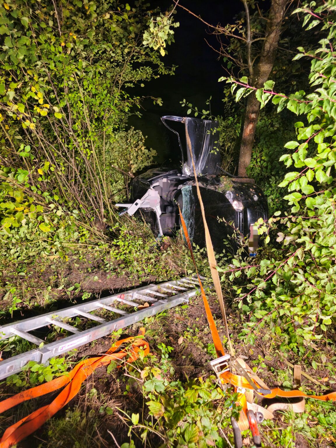 Um Zugang zum Unfallfahrzeug zu erhalten, mussten zunächst mit der Motorsäge dichte Sträucher entfernt werden. Bei der Lageerkundung fanden wir eine eingeschlossene sowie eine eingeklemmte Person vor.